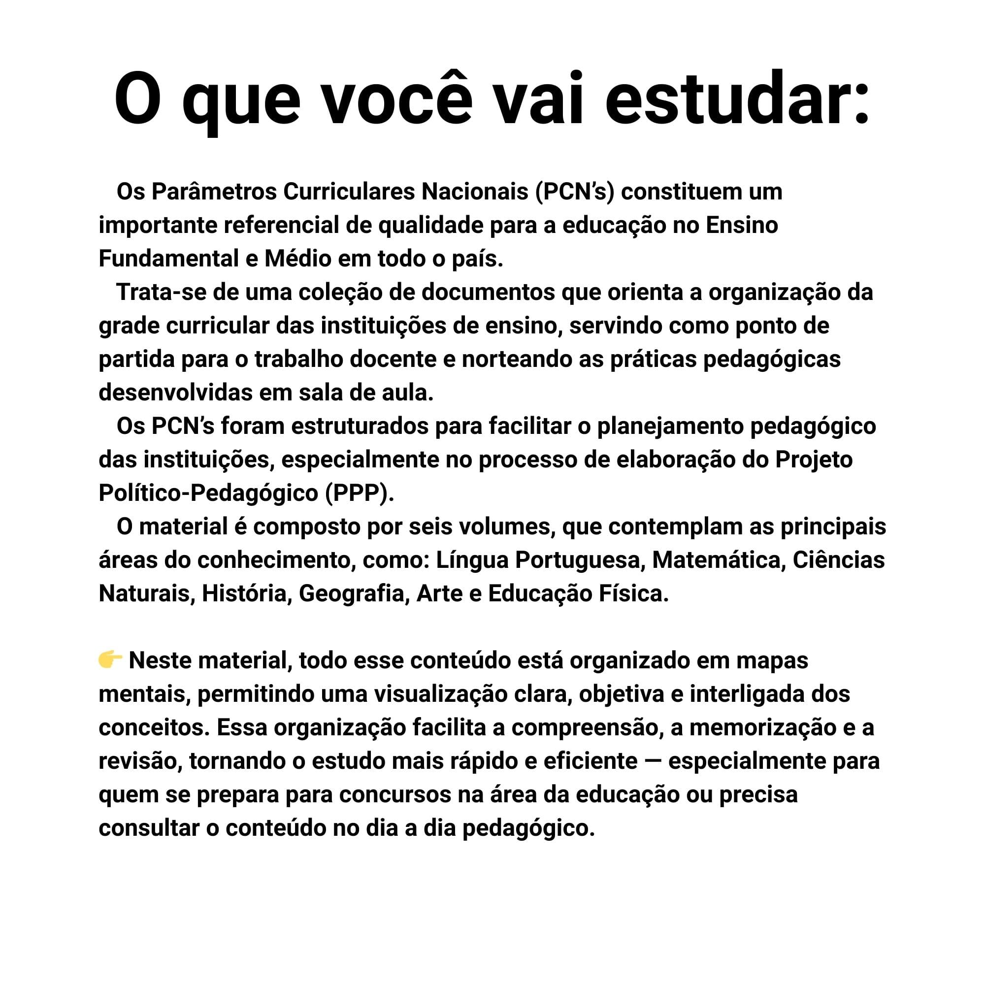 👉 Neste material, todo esse conteúdo está organizado em mapas mentais, permitindo uma visualização clara, objetiva e interligada dos conceitos. Essa organização facilita a compreensão, a memorização e a revisão, tornando o estudo mais rápido e eficiente — especialmente para quem se prepara para concursos na área da educação ou precisa consultar o conteúdo no dia a dia pedagógico.