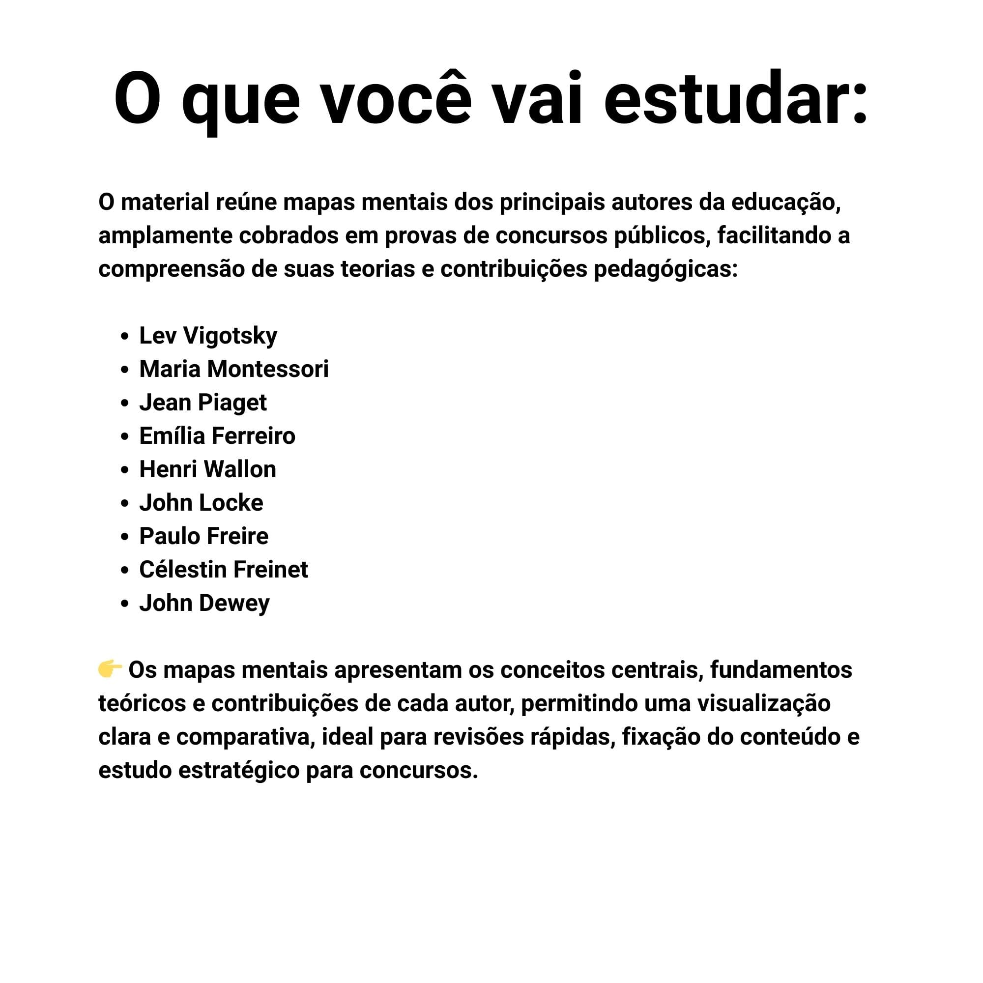 👉 Todos os autores são apresentados em mapas mentais, destacando conceitos centrais, fundamentos teóricos, métodos, objetivos educacionais e principais contribuições, o que facilita a comparação entre autores, a fixação do conteúdo e a revisão rápida, tornando o estudo muito mais estratégico e eficiente para concursos da área da educação.